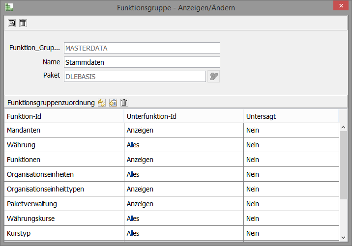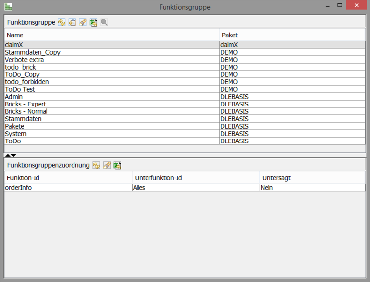 Funktionsgruppen gruppieren einzelne Funktionen. Im Berechtigungssystem werden diese Funktionsgruppen dann Benutzergruppen zugeordnet, so dass die zu den Benutzergruppen gehörenden Benutzer eine Berechtigung auf die Funktionen erhalten.
