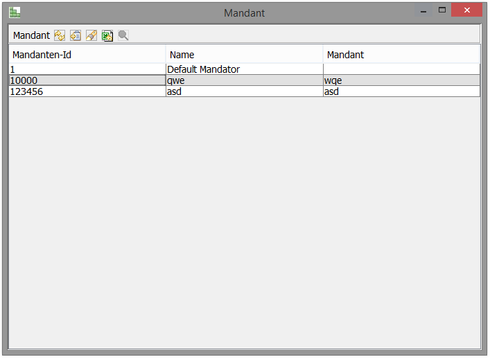 Die Stammdatenmaske für Mandanten zeigt eine Tabelle mit allen definierten Mandanten. Hier können die bestehenden Mandanten geändert und gelöscht werden, sowie neue Mandanten hinzugefügt werden.