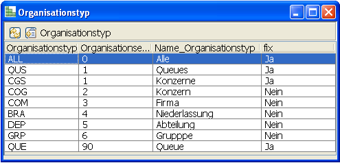 Über das Menü Stammdaten→Organisationseinheit→Organisationstyp öffnet man die Übersichtsmaske der definierten Organisationstypen. Zur Erläuterung des Zusammenhangs zwischen Organisationstypen und Organisationseinheiten, siehe voriges Kapitel.
