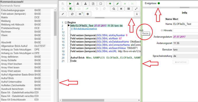 Diese kann angepasst werden, um z.B. den Editor zu vergrößern oder das Menü wegzuklappen, solange man an einem Brick arbeitet. Die Anpassung geschieht durch die ganze DLE hindurch über graue Leisten (im Bild mit roten Pfeilen markiert). Durch ziehen an den Leisten lassen sich Bereiche vergrößern und verkleinern (im Bild mit rotem Kreis markiert). Mit einem Klick auf den dunkelgrauen Bereich in der Mitte einer Leiste wird der Bereich auf- und zugeklappt.