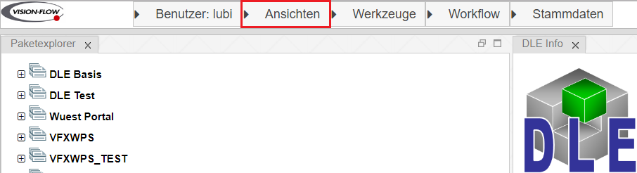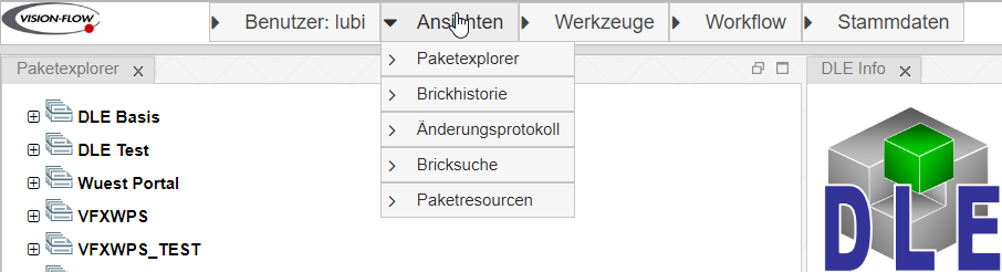 Die DLE 2.0 bietet verschiedene Möglichkeiten, um sich einen Überblick über Pakete und Bricks zu verschaffen. Eine Ansicht wird ausgewählt, indem die Maus über den "Ansichten"-Menüpunkt bewegt wird und anschließend auf die gewünschte Ansicht geklickt wird.