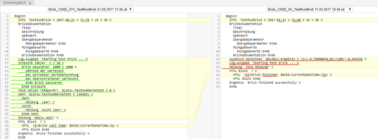 Durch einen Klick auf die Option "Mit aktuellem vergleichen" öffnet sich das Brickvergleich-Fenster im rechten Bereich. In diesem werden die Unterschiede zwischen der aktuellen und ausgewählten Brickversion dargestellt. Alle gelb hinterlegten Zeilen wurden zwischen den Versionen verändert. Alles was rot unterstrichen ist wurde in der neuen Version entfernt, alles was grün unterstrichen ist hinzugefügt. Über die Dropdown-Listen über den beiden Brickversionen lässt isch einstellen, welche Versionen verglichen werden sollen.