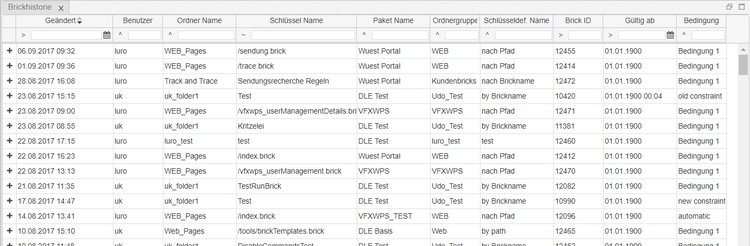 In der Brickhistorie werden Informationen wie beispielsweise Änderungsdatum, Schlüssel Name und Ordner Name aller Bricks aufgelistet.