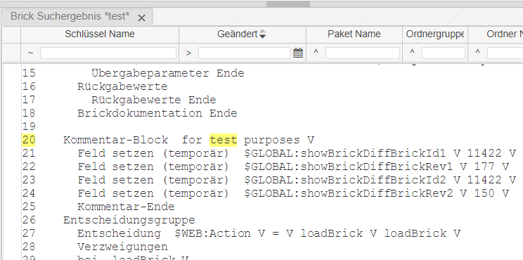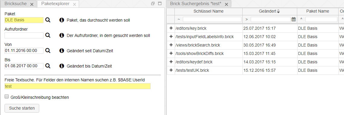 Über die Bricksuche wird eine Suchmaske geöffnet, in der mittels Paket, Aufrufordner, Änderungszeiten und einer freien Textsuche gewisse Bricks gefunden werden können.