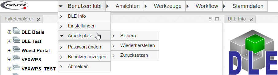 • DLE Info: Zeigt die Informationen der DLE an (z.B. aktuelle Version, Sprache, Lizenznehmer, ...).
