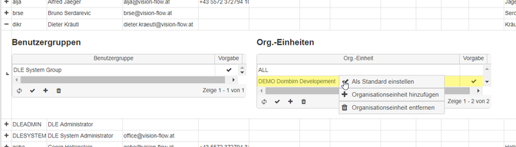 Mit der Benutzerliste können in der DLE Benutzer definiert werden und diese Benutzergruppen und Organisationseinheiten zugeordnet werden.