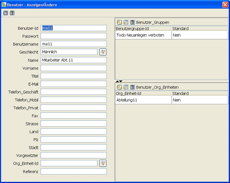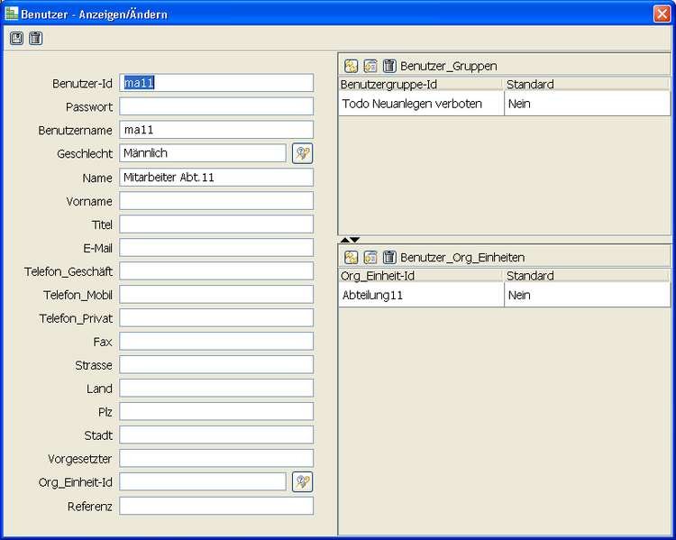 Wichtige Felder sind „Benutzer-Id“ und „Passwort“ – diese braucht der Benutzer, um  überhaupt mit der DLE arbeiten zu können. Ein hinterlegter Benutzer kann sich zwar anmelden, er besitzt aber so gut wie keine Rechte. Ausgenommen sind hierbei die Änderung des eigenen Passwortes sowie das Anschauen und Kontrollieren der eigenen Berechtigungen. Um dem Benutzer überhaupt Rechte vergeben zu können, muss dieser einer oder mehreren Benutzergruppen zugeordnet werden. Werden diesem Benutzer auch „ToDo“-Rechte vergeben, dann er zumindest einer Organisations­einheit zugeordnet werden.