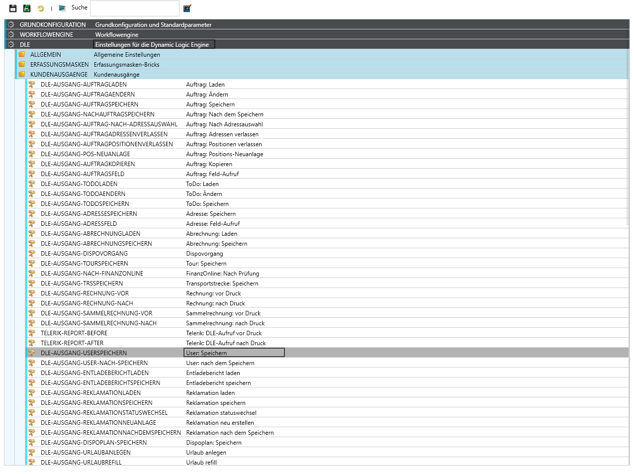 In Log-o unter Konfigurationen > DLE > KUNDENAUSGAENGE bei DLE-AUSGANG-USERSPEICHERN und DLE-AUSGANG-USER-NACH-SPEICHERN muss bei KON(Konzern) der Schalter auf "Ein" gesetzt werden