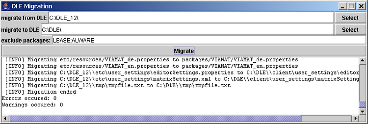 Mit einem Klick auf den Button "Migrate" wird der Migrationsprozess gestartet. Im darunter liegenden Textfeld erscheinen die Logausgaben wobei im grafischen Modus alle Ausgaben protokolliert werden (siehe Kommandozeilen-Parameter dle.migratedebug). Die Zusammenfassung über die Anzahl der Warnungen und Fehler erscheint am Ende des Logs.