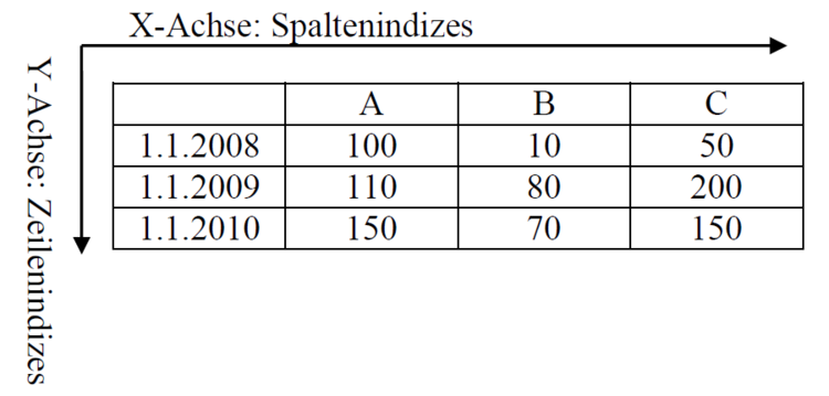 Der Aufbau eines Arrays umfasst prinzipiell zwei Indizes, von denen einer entlang der X-Achse der Tabelle verläuft, also die Spalten bezeichnet und einer entlang der Y-Achse verläuft und die Zeilen bestimmt.