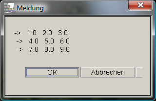 Das folgende Beispiel soll mit einfachen Mitteln die Anwendung der Gruppenwechsel veranschaulichen. Dargestellt wird die bekannte Tabelle in einer Meldung in Tabellenform, wobei jede Zeile mit einem Pfeil beginnt und mit einem Zeilenumbruch beendet wird.
