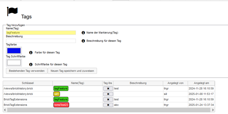 Duch einen Klick auf einen bestehenden Tag in der Tabelle wird das Auswahlfeld mit diesem Tagnamen vorbelegt.
