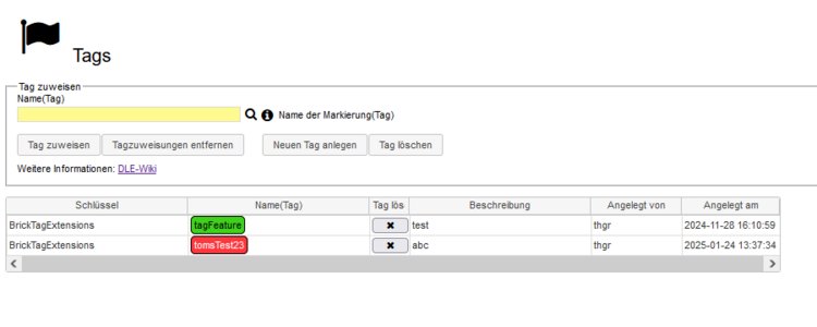 Über die Brickübersicht/Erweitert können DLE-Schlüssel mit sogenannten Tags versehen werden.